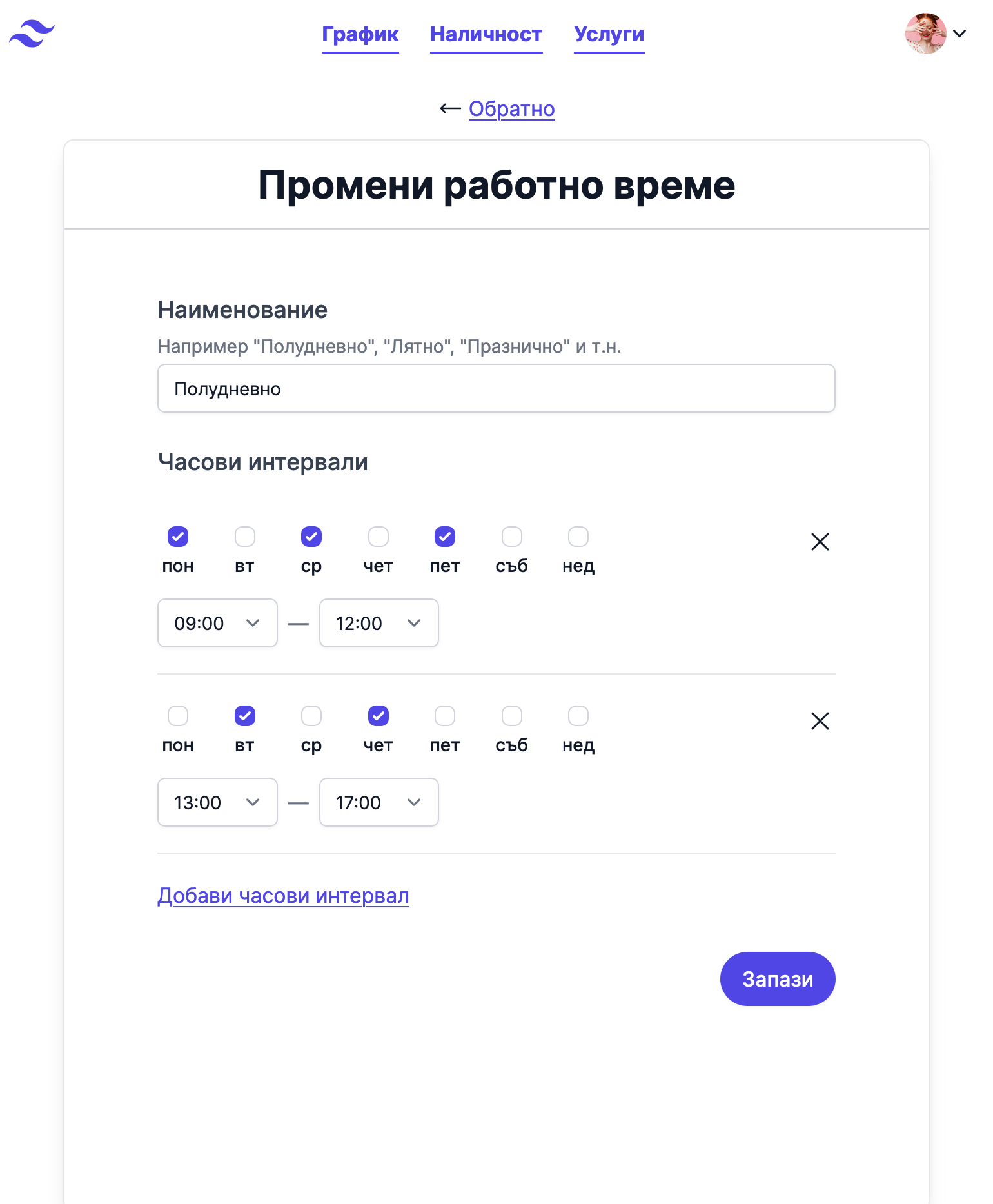 Различен часови интервал за различните дни от седмицата или един за всеки. Определи работното време според нуждите си.
